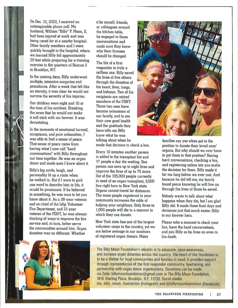 I want to introduce you to my friend Kristina Moon. Kristina lost her husband, Billy Moon, in the line of duty nearly a year ago. Billy was an FDNY firefighter and member and past chief of the Islip (Long Island) Volunteer Fire Department.